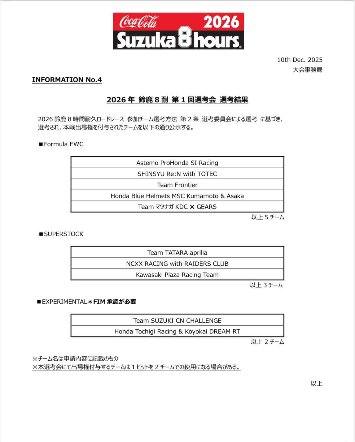 12月10日、2026年鈴鹿8耐 第1回選考会において本戦出場権を付与されました!