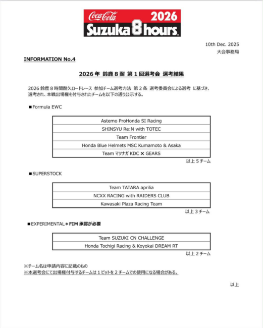 2024年 FIM世界耐久選手権 鈴鹿8時間耐久ロードレース 総合24位完走、EWCクラス20位